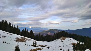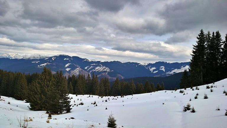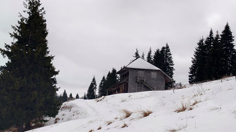 Acesta devenise din ce in ce mai dificil, poteca avand zone mai abrupe si inghetate. Tot alunecul asta ne-a obosit si mergeam de peste 4 ore. Ne uitam pe aplicatia Muntii Nostri si vedem ca nu ar mai fi mult pana la Poiana unde se afla stana si parca nu mai simteam chiar asa de rau oboseala, stiind ca ne vom trage sufletul la stana. Bucurosi, o luam pe un drum cam salbatic, in pomi se tot auzeau zgomote, inaintam si tot inaintam si nici urma de luminis. Cand ne uitam pe aplicatie, am vazut ca eram pe un drum gresit si ne indepartasem destul de mult de traseu. Am facut cale intoarsa cu sufletul strans de deznadejde. Gandul de a ne intoarce nu ne dadea pace. Dar pentru ca suntem amandoi perseverenti, ne-am intors in poteca spre stana si am continuat incetisor. Daca pana aici mai fusesera urme de ATV-uri sau de animale, am ajuns intr-o zapada alba ca laptele si neumblata si am ajuns in luminis. Dar stana nu se vedea. Incotro sa o luam? Nu erau deloc urme. A luat-o Dan inainte si eu dupa el, obosita, inghetata, ma udasem si putin la picioare ca imi tot intra zapada. Nu imi luasem parazapezile ca ar fi trebuit sa fie un traseu usor si noi eram la 1700 m, mergeam de peste 5 ore si nici nu ajunsesem la stana. Tot inaintand prin zapada aproximativ 20 de minute (care au durat ore ) am zarit stana.